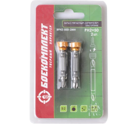 Биты PH2x50мм, двуст., со съемным магнитным держ., сталь S2, 2шт, БОЕКОМПЛЕКТ