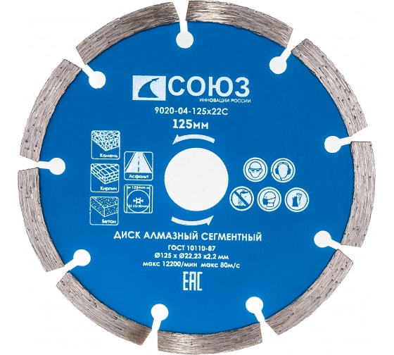 Диск алмазный сегментный СОЮЗ 9020-04-125x22C предназначен для ручных и стационарных резчиков. Применяется для сухого реза по кирпичу, камню и бетону. Корпус диска изготовлен из пружинной стали марки 65Г, что обеспечивает его прочность и упругость. В комплекте поставляется переходное кольцо с посадочного отверстия 22.2 мм на 20 мм.
