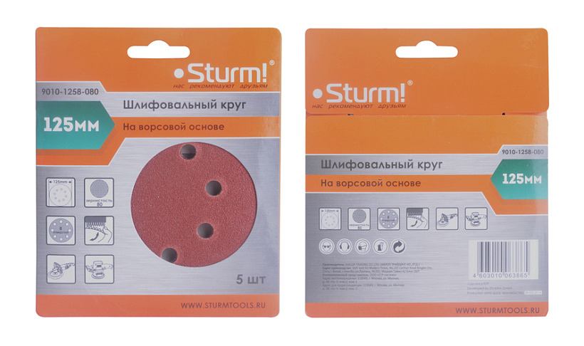 —Круг шлифовальный Sturm! "под липучку", D125мм, зерн. 80, 8 отв., 5 штук.