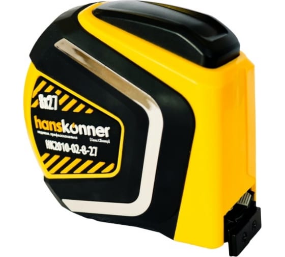 Рулетка Hanskonner 8x27 HK2010-02-8-27 оснащена полотном из хромванадиевой стали с увеличенной толщиной по сравнению с обычными рулетками. Это обеспечивает более дальний вылет без излома ленты. Предельная длина достигает 270 см. Пружина для сматывания полотна также изготовлена из CrV стали и увеличивает ресурс на количество сматываний в 2,5 раза. TPR покрытие корпуса из ударопрочного пластика обеспечивает надежное удержание инструмента в мокрых ладонях. Небольшой вес корпуса также способствует облегченному удержанию в течение продолжительного периода времени. Небольшие размеры упрощают транспортировку инструмента в кармане, а наличие специального металлического зацепа значительно снижает вероятность уронить рулетку. Для безопасного сматывания ленты с любого вылета есть специальный демпфер, который амортизирует мощные удары.