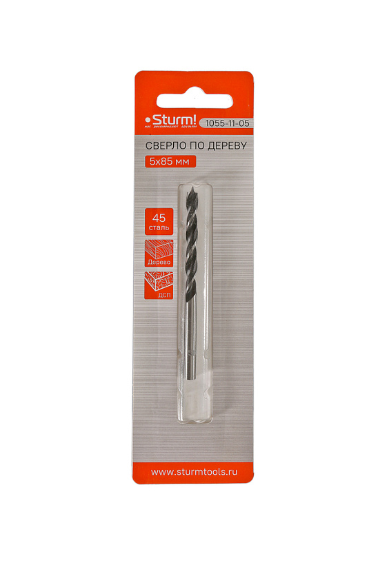 —Сверло спиральное по дереву D=5мм, L=85мм, цил. хв., блистер, Sturm!