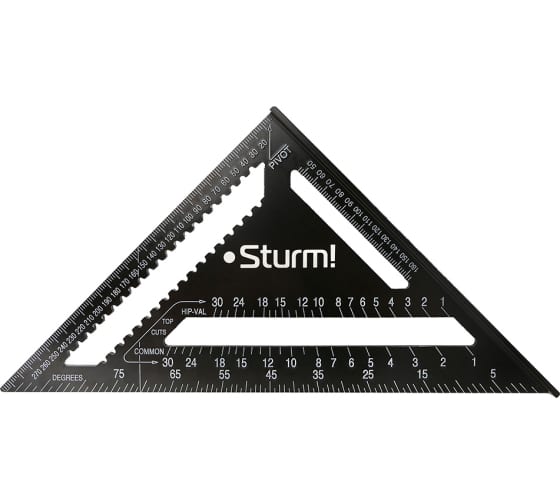 Угольник Sturm 300мм, алюминиевый сплав, чёрная оксидация, белая шкала, 2020-07-300 содержит в себе функции транспортира для точной разметки деталей во время производства стропильной системы каркасного дома, системы лестниц и лестничных маршей. Может быть использован как разметочная опора при резке деталей циркулярной пилой или электрическим лобзиком. Специализированные вырезы для продольной разметки позволяют быстро переносить линии по заготовке. В комбинации с отвесом служит для определения угла уже установленных стропил как с внешней так и с внутренней стороны. Усиленный корпус изготовлен из алюминия методом штамповки для сохранения своей изначальной геометрии. Полностью оксидирован для защиты от коррозии. Контрастная белая шкала для быстрого считывания показаний.