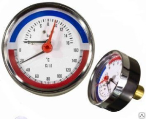 Термоманометр аксиальный - измерительный прибор, предназначенный для показа текущих давления и температуры в бытовых гидравлических системах (отопления и водоснабжения). Для снятия показаний предусмотрены две шкалы.давления и температуры. Комплектуется автоматическим запорным клапаном, позволяющим демонстрировать термоманометр без слива системы.