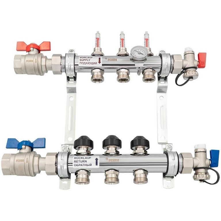 Коллектор для тёплого пола с расходомерами РЕХАУ HKV-D изготавливается из нержавеющей стали и предназначен для систем 2-контурного напольного отопления. Снабжён вентильными регулировочными вставками и расходомерами. Возможно подключение с обеих сторон: как справа, так и слева. Трубы смонтированы на звукоизолирующих оцинкованных кронштейнах. Комплектация коллекторов РЕХАУ HKV-D: 2 распределительные трубы 1" для подачи и отвода теплоносителя, расходомеры на подающей трубе, вентили для регулирования расхода на подающей трубе, запорные вентили на обратной трубе, концевик коллектора с накидной гайкой 1", уплотнительную прокладку, воздухоотводчик 3/8", кран для заполнения 1/2", звукоизолирующие кронштейны, набор крепёжных деталей, маркировочные таблички.
