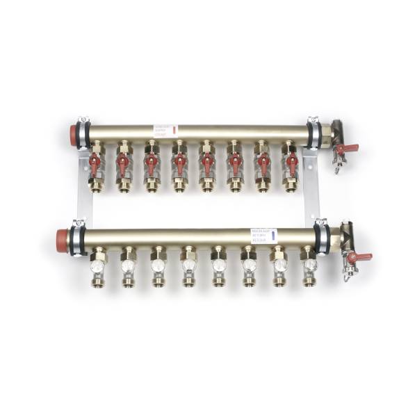 Материал: латунь. Распределительная труба 1 1/2". Отводы 3/4". Оцинкованные шумопоглощающие консоли в соответствии с DIN 4109. С заглушками 1 1/2" на подающей и обратной линиях. С краном для заполнения системы и отвода воздуха. На подающей линии шаровые краны с евроконусом для труб 17 x 2,0 и 20 x 2,0. На обратной линии вентили тонкой регулировки с евроконусом для труб 17 x 2,0 и 20 x 2,0. Резьбозажимные соединения должны заказываться отдельно.