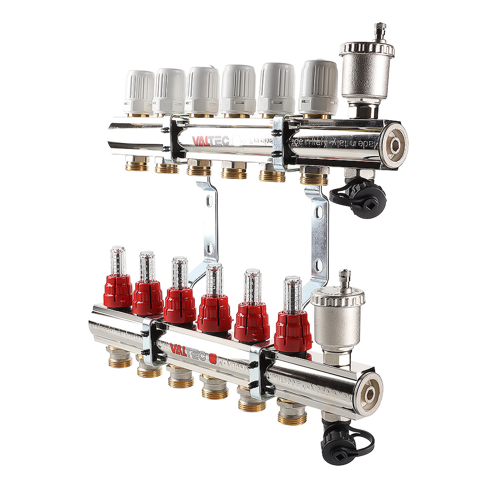 (VTc.596.EMNX) Коллекторный блок со встроенными расходомерами выпускается для распределения теплоносителя к потребителям в системах водяного отопления – радиаторам, конвекторам, петлям теплого пола, обогрева открытых площадок. Рабочая температура теплоносителя – до 90 °С, давление – до 10 бар. На выходах прямого коллектора установлены настроечные клапаны с расходомерами, обратный коллектор оснащен регулировочными клапанами (ручные, с возможностью оборудования сервоприводами). Присоединение трубопроводов к выходам – по стандарту «евроконус». Блок укомплектован также автоматическими воздухоотводчиками с отсекающими клапанами, дренажными кранами, сдвоенными крепежными кронштейнами. Материал коллекторов, корпусов арматуры – латунь CW617N (гальванопокрытие – никелирование), уплотнительных колец соединителей и золотников клапанов – EPDM.