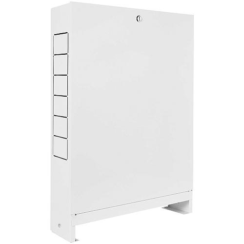 Шкафы коллекторные ROMMER ШРН наружные представляют собой специализированные металлические шкафы, предназначенные для размещения распределительных коллекторов радиаторной или напольной разводки, а также водопровода. Они изготавливаются из листовой стали, окрашенной порошковой эмалью белого цвета RAL 9016, что обеспечивает их долговечность и эстетичный внешний вид. Конструкция шкафов включает корпус, дверцу, лицевую рамку, сегментную перфорацию, выдвижные ножки, крепежные рейки и замок. Внутри шкафа установлены подвижные универсальные профильные крепежные рейки, позволяющие удобно размещать оборудование в любом месте по высоте и ширине шкафа. Крепление коллекторов и другого оборудования производится к монтажным рейкам, которые могут раздвигаться на требуемую ширину, а посадочные болты на них передвигаться по вертикали