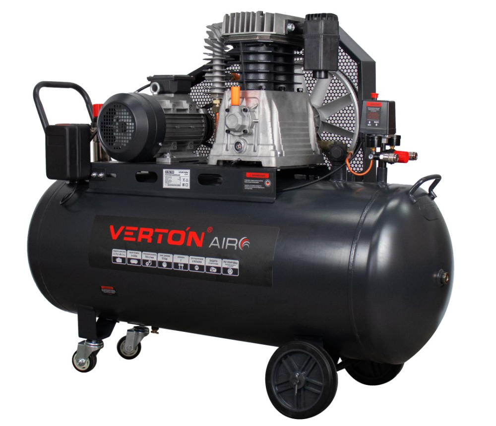 Поршневые ременные компрессоры Verton Air-это профессиональное оборудование с высокой производительностью. Предназначены для выработки сжатого воздуха в большом объеме и длительного интенсивного питания пневмоинструмента. Сферы применения разнообразны - от автосервисных и ремонтных мастерских до строительных площадок и производств. Производительность ременных компрессоров начинается от 410 до 1020 л/мин, установленные ресиверы объёмом от 80 до 300 литров, двигатели от 2,5 до 4 кВт способны нагнетать давление от 10 до 12 Бар. В компрессорах Verton предусмотрено два стандартных выхода с быстросъёмом и два дополнительных выхода через фильтр отстойник с регулятором давления на выходе для получения сжатого воздуха высокого качества. Компрессор Verton Air AC-200/700R с прямым ременным приводом и ресивером увеличенной емкости cлужит для подачи сжатого воздуха, подходит для небольших автомастерских и строительных площадок. Модель оснащается вместительным ресивером на 200 литров, что существенно снижает интенсивность его рабочих циклов. Наличие двух манометров обеспечивает визуальный контроль величины давления и контролировать давление как внутри ресивера, так и на выходе из него. Чугунная головка является устойчивой к механическим повреждениям и увеличенной теплоотдачей. Рукоятка эргономичной формы и транспортировочные колеса облегчают маневренность и удобство транспортировки.