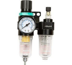 Фильтр влагоотделитель с лубрикатором для пневмоинструмента Sturm 1710-02-02 защищает инструмента от быстрого износа.
