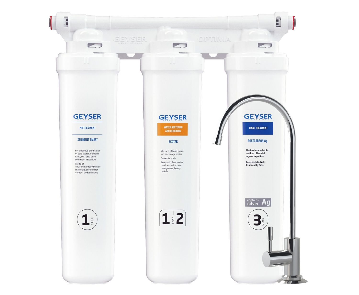 3-х ступенчатый фильтр Гейзер Оптима Старт для жесткой воды Механика Смарт – предочистка воды от нерастворимых примесей. Экотар Смарт – ионообменная смола для удаления солей жесткости, железа и марганца. Посткарбон Ag Смарт – уголь и "Каталон" для удаления хлора и органических соединений. Серебро блокирует размножение бактерий. Комплект поставки системы проточной очистки мягкой воды Гейзер Оптима Старт: Скоба. Набор картриджей. Кран для чистой воды (модель FlowMaster). Трубка соединительная 1/4”. Тройник-адаптер. Инструкция. Рекомендуемый ресурс картриджей: Механика Смарт – до 6 мес. Комби Смарт – до 2 мес. Баскон Смарт – до 12 мес.