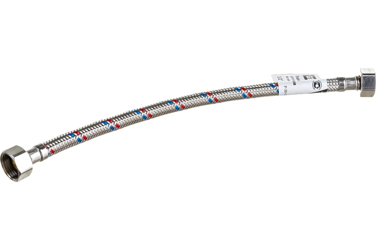 Подводка гибкая для воды с оплеткой из нержавеющей стали 1/2"х30 см г/г P-30-GG предназначена для подключения сантехнического оборудования (смывных бачков, водонагревателей, стиральных и посудомоечных машин) к трубопроводам системы горячего и холодного водоснабжения. Представляет собой гибкий шланг, внутренняя трубка которого изготовлена из этилен - пропиленового каучука (EPDM), покрытого оплеткой из стальных нитей (нержавеющая сталь AISI 304).