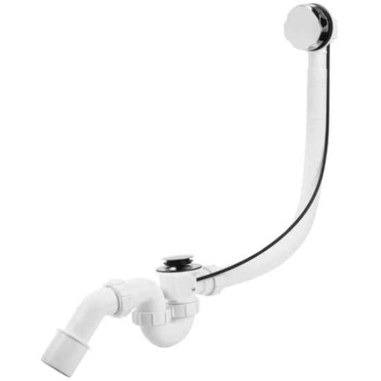 Сифон для ванны (слив-перелив) полуавтомат. Применяется для подключения любых ванных к системе канализации. Диаметр сливного отверстия 70 мм, сливной пробки 70 мм. Отличительной особенностью является наличие поворотной головки, с помощью которой осуществляется открытие/закрытие сливной пробки. Выпуск, сливная пробка, перелив сделаны из металла. Удобное и надежное управление. Выход у сифона (компрессионный) сделан под отводную трубку, диаметром 40 или 50 мм. Характеристики: Диаметр выхода: 40 мм (1 1/2") Длина переливной гофры: 380-700 мм Высота сифона: 115 мм