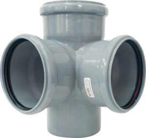 Крестовина двухплоскостная 110/110/110 х 87° имеет четыре ответвления равного диаметра 110 мм, три из которых являются входом и одно - выходом (равнопроходная крестовина). У такой крестовины диаметры обоих ответвлений равны диаметру основного стояка.