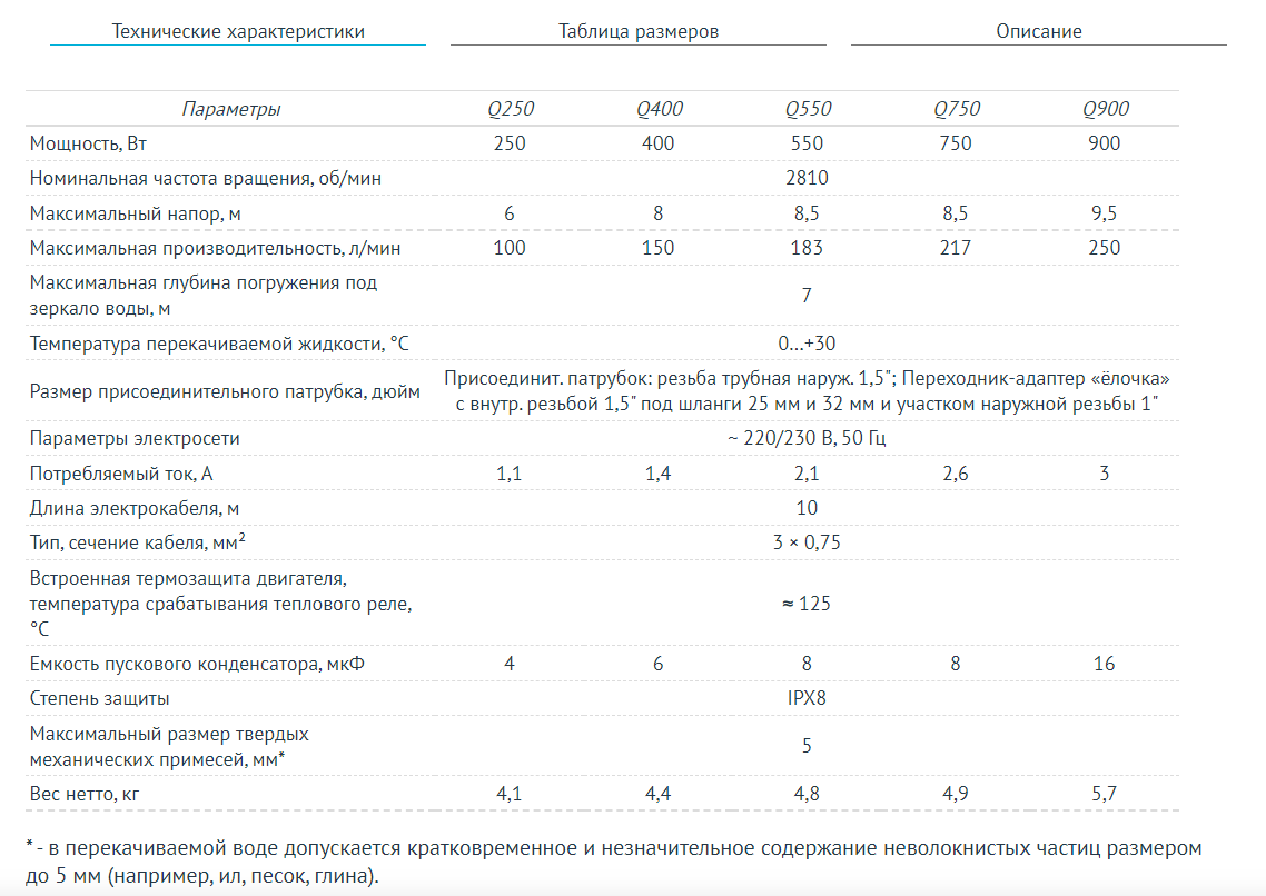 Двигатель имеет встроенное термо-реле для защиты от перегрузок при аварийных режимах работы. Насос поставляется в комплекте с трехжильным электрическим кабелем с вилкой.